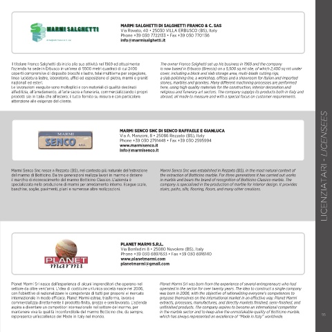 Ditta artigiana fondata nel 1972 specializzata nella lavorazione su misura di This artisan company, founded in 1972, is specialized in the manufacturing and Marmi Senco Snc nasce a Rezzato (BS), nel contesto più naturale dell’estrazione Marmi Senco Snc was established in Rezzato (BS), in the most natural context of LICENZIATARI - LICENSEES